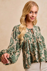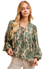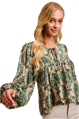 The Lara Front Tied Blouse brings a playful twist to your wardrobe with its charming printed woven fabric and balloon sleeves that add just the right touch of flair. Featuring a slight stretch for comfort and a pretty ornament print, this blouse ties at the front for a flirty, effortless look you'll love to wear day or night.