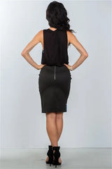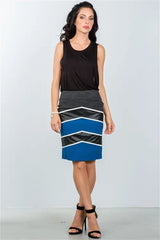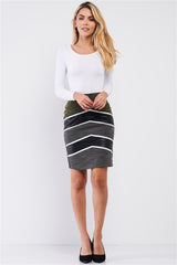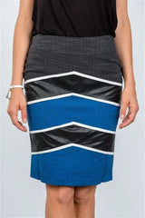 High Waisted Knee Length Skirt. Lined. Exposed Back Zipper Closure.