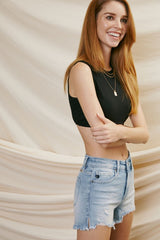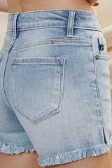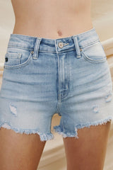 The Ever So Comfy Kan Can Denim Is In Store Now. A High Rise of 9.5" & An Inseam Of 3.5" Is The Perfect Combination For The Best Fit. A Medium Wash With Distressing and Whiskering. A Slight Hi Low Hem.