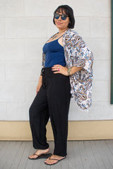 Fit - Free flowing, bohemian style. They're also 1 inch smaller than the tall pants, all around, thus they're tighter. If you're curvy and over 5'4", we recommend going with the tall. If you're over 5'5" they'll still fit, they just wouldn't be as flowy or have as much room as the Tall Scrunched Bottoms.