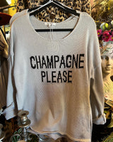 Stay cozy while you pop bottles in this "CHAMPAGNE PLEASE" lightweight knit sweater! With side slits and a round neck, you can feel sophisticated and comfy all day. So grab a glass and slip on this sweater for a toast-worthy style! Drop Shoulder & size slit. Slightly Longer back hem