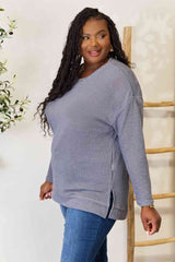 The waffle-knit round neck long sleeve slit sweatshirt is a cozy and stylish addition to any wardrobe. The waffle-knit fabric adds texture, while the slit detail adds a touch of unique flair.