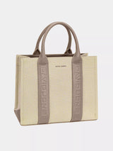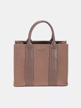 This sophisticated structured canvas handbag features premium brown canvas material with contrasting leather handles and trim. The bag showcases a professional rectangular silhouette with reinforced construction for durability. Logo-printed straps add brand recognition while the spacious interior makes it perfect for work, travel, or daily use. The neutral brown color palette ensures versatility with any outfit, while the sturdy double handles provide comfortable carrying options.